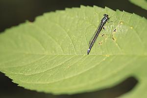 A damselfly perches gracefully on a green leaf, its delicate body and shimmering wings blending into the natural world. The leaf’s texture and small imperfections reflect nature’s quiet beauty and resilience, framing this tiny moment of stillness.